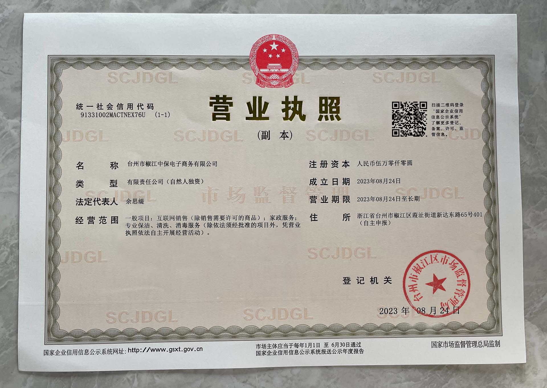 Corporate name:Taizhou Jiaojiang Zhongbao E-commerce Co., Ltd
